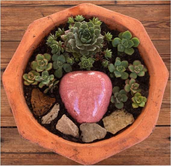 Like any other art form, succulent art design calls for creativity. Essentially, you are making a living picture that will grow. For this reason, unless you are creating succulent art in a garden bed, you probably won’t want to incorporate plants that will eventually grow tall. Or, if you do, you must be prepared to plant them out when you do and replace them with lower-growing succulents.