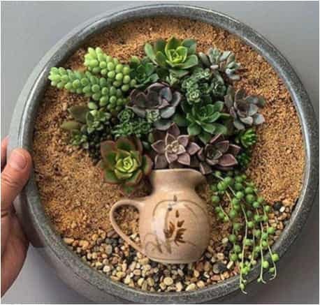 It’s usually best to stick to one or two different plant types for effect. But there are no hard and fast rules. Do what appeals to you. You can repot your succulents if the arrangement doesn’t work.